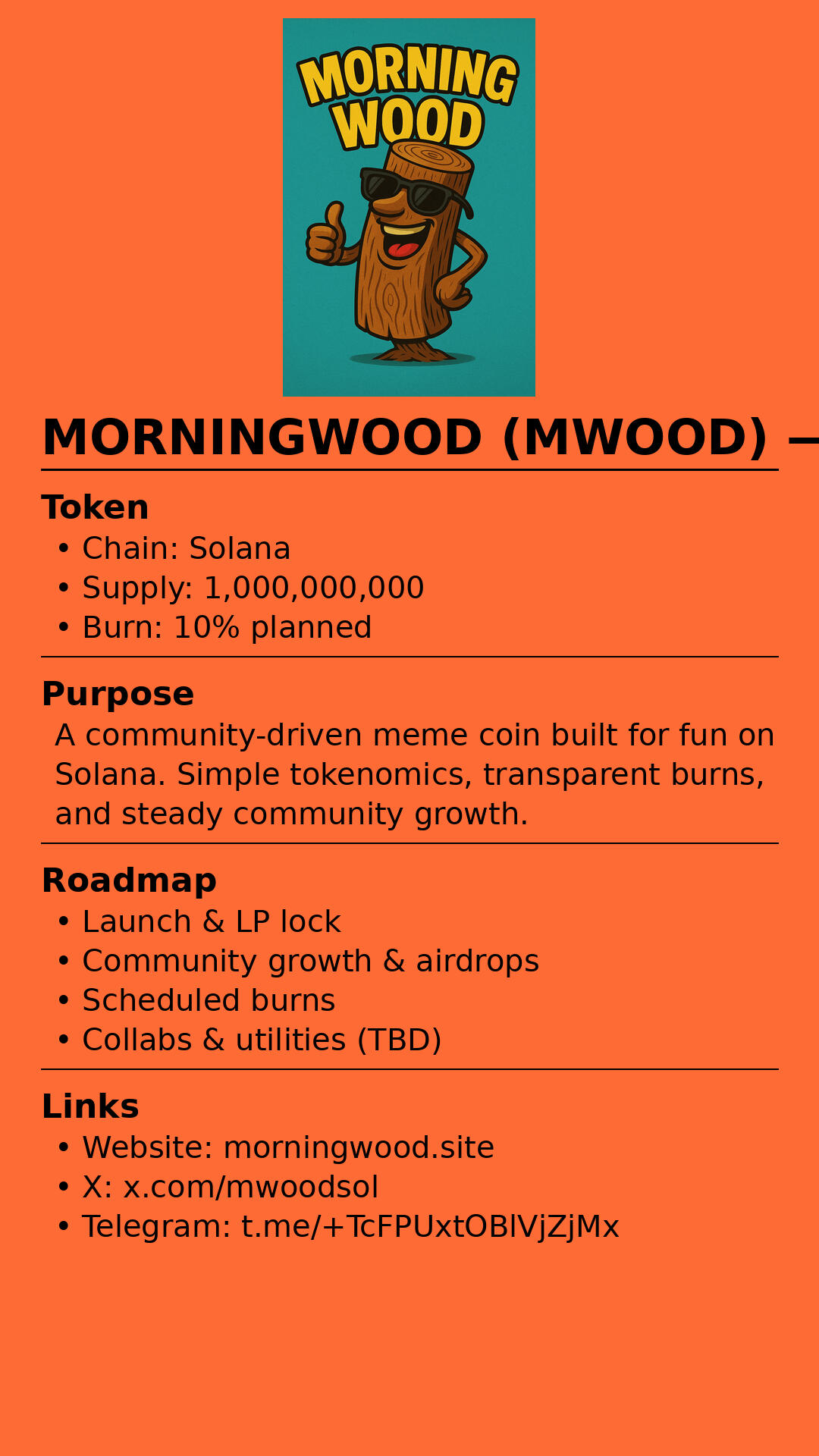 We rise fast, hold strong, and never let the community down.Fueled by laughs, hype, and a stiff resistance to market dips, $MWOOD isn’t just a token — it’s a movement.We’re here to pump spirits and portfolios alike, proving that sometimes the best gains come with a good laugh.💰 Tokenomics Highlight: